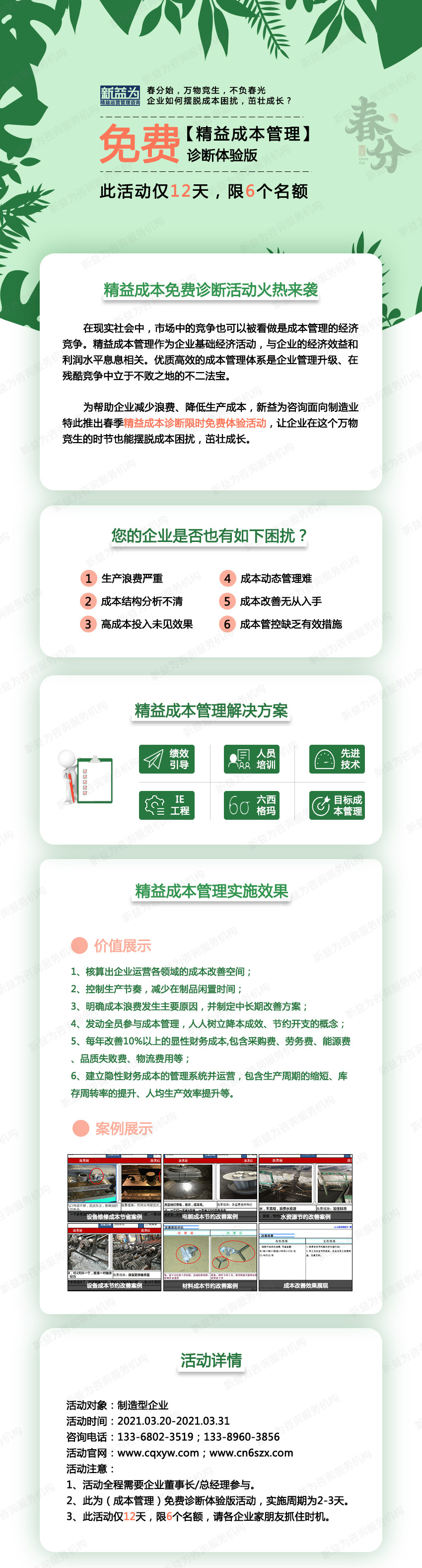 在現(xiàn)實(shí)社會中,市場中的競爭也可以被看做是成本管理的經(jīng)濟(jì)競爭。精益成本管理作為企業(yè)基礎(chǔ)經(jīng)濟(jì)活動,與企業(yè)的經(jīng)濟(jì)效益和利潤水平息息相關(guān)。優(yōu)質(zhì)高效的成本管理體系是企業(yè)管理升級、在殘酷競爭中立于不敗之地的不二法寶。 為幫助企業(yè)減少浪費(fèi)、降低生產(chǎn)成本,新益為咨詢面向制造業(yè)特此推出春季精益成本診斷限時免費(fèi)體驗(yàn)活動,讓企業(yè)在這個萬物競生的時節(jié)也能擺脫成本困擾,茁壯成長。